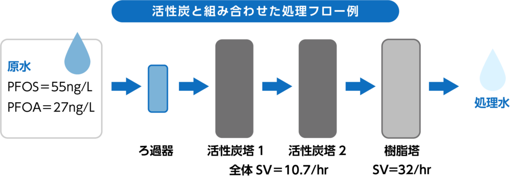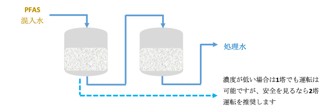 吸着剤に影響を与える余分な有機物を前段活性炭で除去、PFASについては後段吸着剤で処理する形とすれば安定して処理を継続することが可能となります。