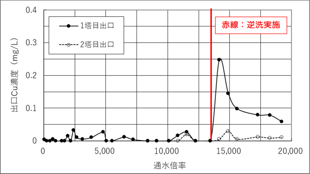 逆洗により飽和樹脂が出口側へ移動し、リークの原因となる可能性があります。