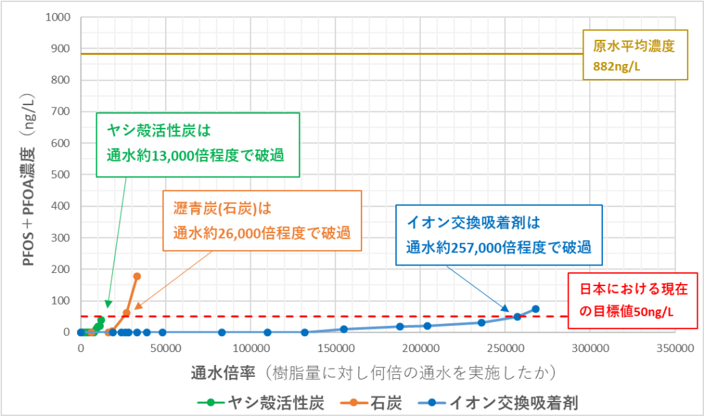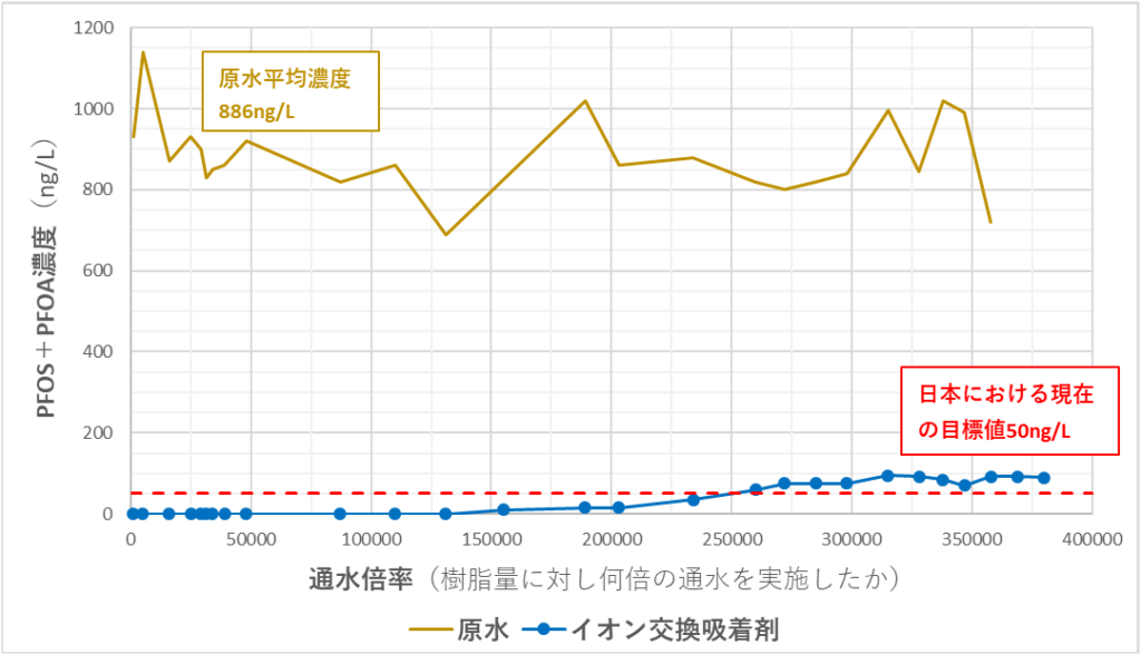 前ページに提示した井戸水原水に対し活性炭2塔+PFAS除去用吸着剤1塔に通液した際の処理挙動は以下の通りとなります。