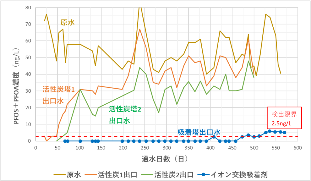 原水は平均70ng/L程度、前段活性炭出口水は50日付近より上昇し始めますが、後段の吸着塔出口水は500日通水した時点でも10ng/L以下に処理されております。